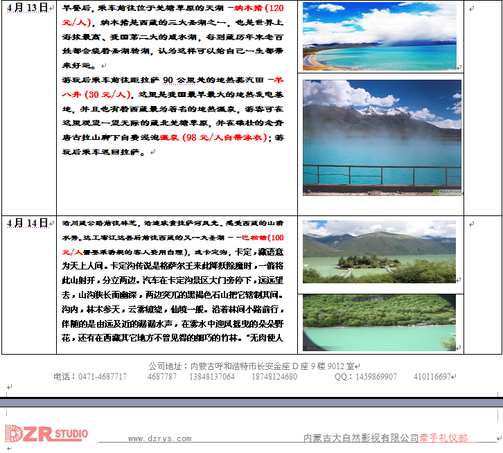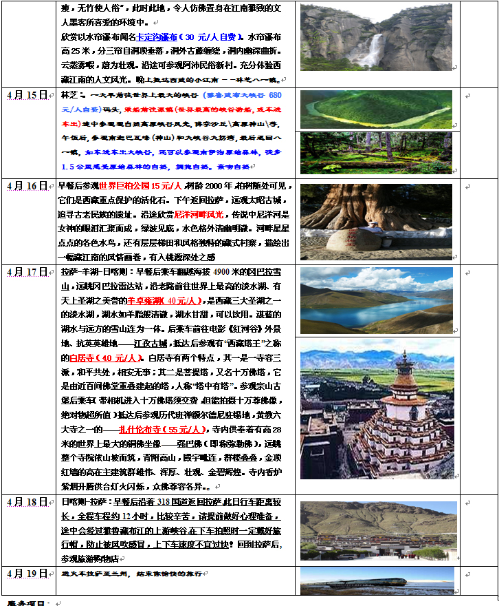 公司保健醫生全程陪護并給每位游客送全險一份 備注:尊敬的組團社,根據2009年5月1日起,旅游新法規有關(guān)條例規定, 參團游客在我地旅游中所為游、購、娛、吃、住、行,以實(shí)事求是的原則、以參團游客的意見(jiàn)單簽字為準,回家再有投訴不于認可.請尊照執行. 自費項目:羊八井洗溫泉98元/人,(可洗或不洗,以自己身體素質(zhì)決定,不限制.自帶游泳裝備) 自費項目:西藏具有特色的藏歌藏舞,有兩種檔次《唐古拉風(fēng)》180元/人含風(fēng)味藏晚餐,一種是280 元/人不含餐《幸福在路上》、《喜馬拉雅》 總價(jià):4200元/人 全程跟蹤拍攝,免費送碟(光盤(pán)) 公司地址:內蒙古呼和浩特市長(cháng)安金座D座9樓9012室 電話(huà):0471-4687717 4687787 13848137064 18748124680 QQ: 1459869907 410116697 |