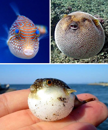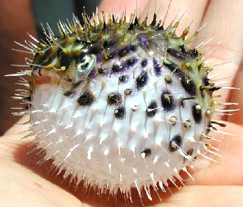 當這種樣子怪怪的魚(yú)想讓自己看起來(lái)更大、更兇猛時(shí),它們會(huì )大口大口的喝水。一些種類(lèi)的鲀魚(yú)在膨脹時(shí),成排的刺毛會(huì )豎起來(lái),其中一種因此被稱(chēng)作豪豬魚(yú),這一特點(diǎn)讓它們比其他類(lèi)型的鲀魚(yú)更強一些。盡管如此,對小魚(yú)來(lái)說(shuō),海洋環(huán)境仍是兇險重重。即使看起來(lái)像一個(gè)長(cháng)滿(mǎn)刺的球,它們仍無(wú)法阻止大鯊魚(yú)的進(jìn)攻,海洋中到處都有鯊魚(yú)。這也是一些鲀魚(yú)增加有毒保護層的原因。事實(shí)上鲀魚(yú)是地球上毒性位居第二的脊椎動(dòng)物,毒性?xún)H次于黃金箭毒蛙。那些在日本餐館的菜單上看到“鲀魚(yú)”字樣的人,應該謹記這種動(dòng)物是有毒的。 |