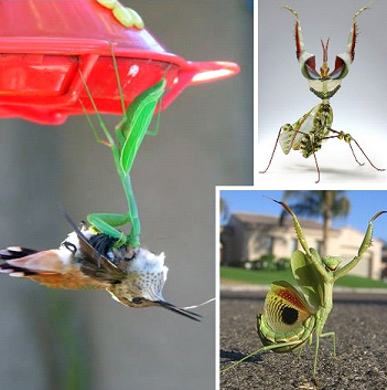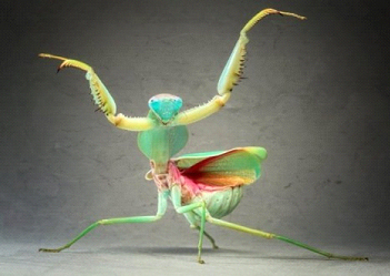 螳螂是可怕的食肉動(dòng)物,它們能吃掉小蜥蜴、青蛙、蛇、蜂鳥(niǎo),甚至小嚙齒動(dòng)物。在這個(gè)自相殘殺的世界,大型動(dòng)物(鳥(niǎo)和嚙齒類(lèi)動(dòng)物等)吃掉小型動(dòng)物更普遍,即使最有膽量的螳螂到了緊要關(guān)頭,也需要防御措施?!耙У裟X袋”是人類(lèi)常干的事,螳螂通常會(huì )通過(guò)揮舞前腿、展開(kāi)翅膀、露出翅膀下面顏色鮮明的斑紋,來(lái)威懾對手。 |