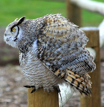 大部分?zhù)B類(lèi)都能讓自己的羽毛蓬松起來(lái),但是貓頭鷹卻把這種能力當作一種保護策略。即使巨角貓頭鷹也有天敵(經(jīng)常是鷹),因此它們必須通過(guò)讓羽毛蓬松起來(lái),讓自己看起來(lái)更大,來(lái)威懾攻擊者,用這一招對付愛(ài)投機取巧的老鷹,非常管用。即使雪鷗(Snowy Owls)也用這招躲避天敵襲擊,雖然在北極冬天白雪皚皚的環(huán)境映襯下,一身雪白的雪鷗很難被發(fā)現,但是到了春天,它的白羽毛會(huì )脫落,長(cháng)出一身顏色更暗的羽毛,這時(shí)的它們很容易成為天敵的捕獵目標。 |