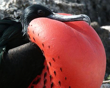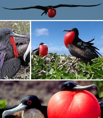 軍艦鳥(niǎo)在熱帶地區筑巢,生活在那里它們很容易找到食物,例如魚(yú)和小海龜等海洋生物。雄軍艦鳥(niǎo)會(huì )向“女士們”展示它們胸部的鮮紅色“喉囊”,通過(guò)充氣,雌軍艦鳥(niǎo)會(huì )認為它們的喉囊很耀眼,很美觀(guān)。雌鳥(niǎo)沒(méi)有這種喉囊,只有一些白色羽毛。軍艦鳥(niǎo)還會(huì )通過(guò)騷擾其他帶著(zhù)獵物歸來(lái)的海鳥(niǎo)獲得食物。通過(guò)對其他正在飛行的鳥(niǎo)兒進(jìn)行干擾,它們經(jīng)常會(huì )得到從其他海鳥(niǎo)嘴里掉落下來(lái)的食物。 |