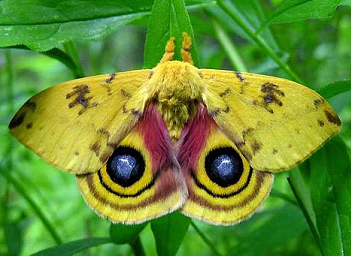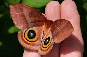 大蠶蛾是一種最鮮艷和驚人的“眼蛾”,它利用振動(dòng)翅膀和可怕的斑紋擾亂和嚇唬潛在的食肉動(dòng)物。靜止不動(dòng)時(shí),大蠶蛾展示的只是前翅的最外層,這一層逐漸從淡黃色變?yōu)槔鹾稚?,很像覆蓋在林地上的雜物。然而,要想讓保護色產(chǎn)生作用,大蠶蛾必須快速露出翅膀下面的斑紋,每個(gè)翅膀內側都有一個(gè)大大的眼斑。這些斑紋跟眼睛非常相像,它們可能是數百萬(wàn)年來(lái)進(jìn)化的需要,翅膀上的斑紋最像眼斑的大蠶蛾幸存下來(lái),那些斑紋不像眼睛的蛾子被天敵吃掉了。 |
